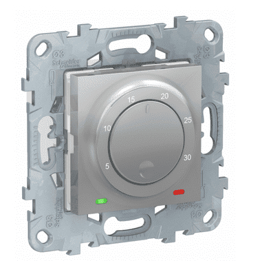 Термостат электронный 8А со встроенным термодатчиком SE Unica NEW, алюминий - это современное устройство для автоматического контроля и регулирования температуры в помещении. Он оснащен встроенным термодатчиком, который позволяет точно измерять температуру и поддерживать заданный уровень комфорта.Этот термостат имеет максимальную нагрузку до 8А, что обеспечивает возможность управления отопительным оборудованием большей мощности. Корпус из алюминия делает его прочным и надежным в использовании.