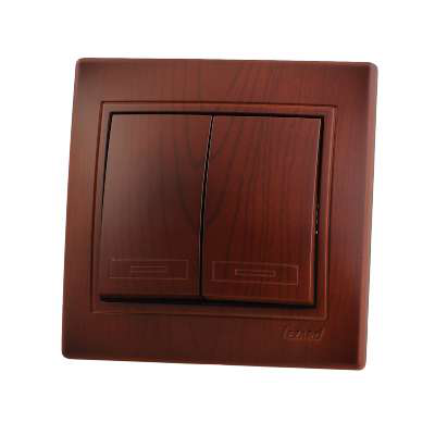 Выключатель двойной. Изделия с расцветкой «под дерево» изготовлены из покрашенного «под фактуру» пластика, а не оклеены цветной пленкой.Безопасные для рук крепежные выступы с пружиной и возвратом в исходное положение. Серебряные контакты, выполнены по стандарту из сплава.