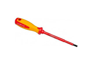 Отвертка шлицевая диэлектрическая SL 4x100мм, 1000 В, Insulated CrMo, двухкомп.рукоятка// MATRIX PROFESSIONAL 12916 - это профессиональный инструмент для работы с электрическими устройствами под напряжением до 1000 В. Изготовлена из хром-молибденовой стали для повышенной прочности и долговечности. Рукоятка инструмента выполнена из двухкомпонентного материала для удобного и надежного хвата. Предназначена для работы с винтами со шлицевой головкой размером 4 мм и длиной 100 мм. Подходит как для профессионального использования, так и для домашнего ремонта.