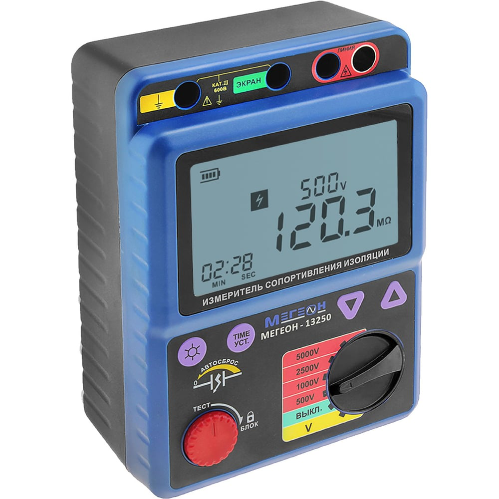 Измеритель сопротивления изоляции – мегаомметр МЕГЕОН 13250 к0000011557 имеет функции измерения напряжения и сопротивления изоляции, а также вычисления индекса поляризации. Отличается простотой в использовании и высокой точностью. Дисплей с подсветкой позволяет комфортно работать в слабоосвещенных местах. Прибор автоматически отключается после 10-ти минут бездействия для экономии заряда источников питания. В случае выхода за верхний предел диапазона измерения появляется специальный индикатор. Прибор внесен в государственный реестр СИ, под номером 74507-19, срок периодической поверки составляет два года. Тестовое напряжение: 500, 1000, 2500, 5000 В.
