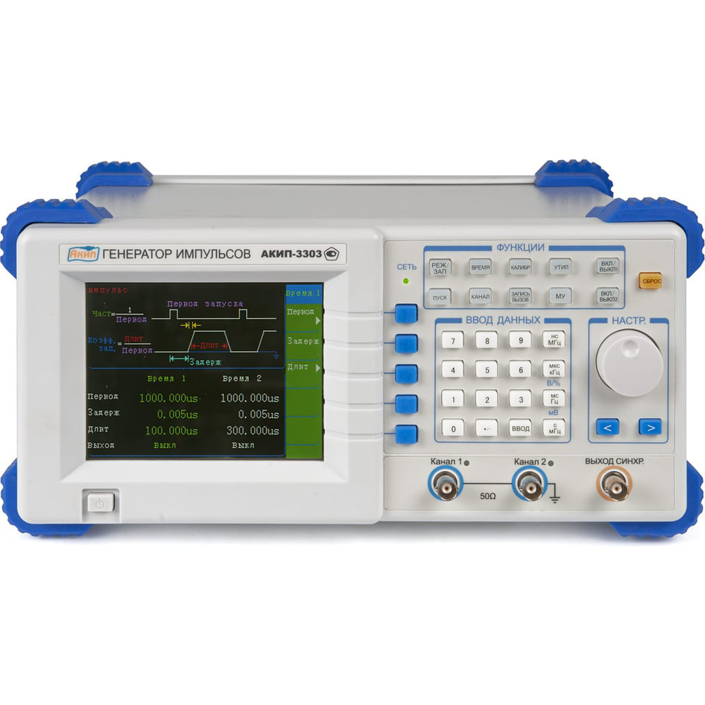 Генератор импульсов АКИП-3303 применяется для генерации импульсов напряжения прямоугольной формы. Принцип действия прибора основан на технологии прямого цифрового синтеза. Генератор широко используется для экспериментальных исследований и образовательных приложений, в лабораторном тестировании, электронном моделировании, техническом дизайне, отладке и ремонте РЭА. Прибор выполнен в форме компактного моноблока, на передней панели которого расположены органы управления и дисплей. Есть встроенное программное обеспечение.