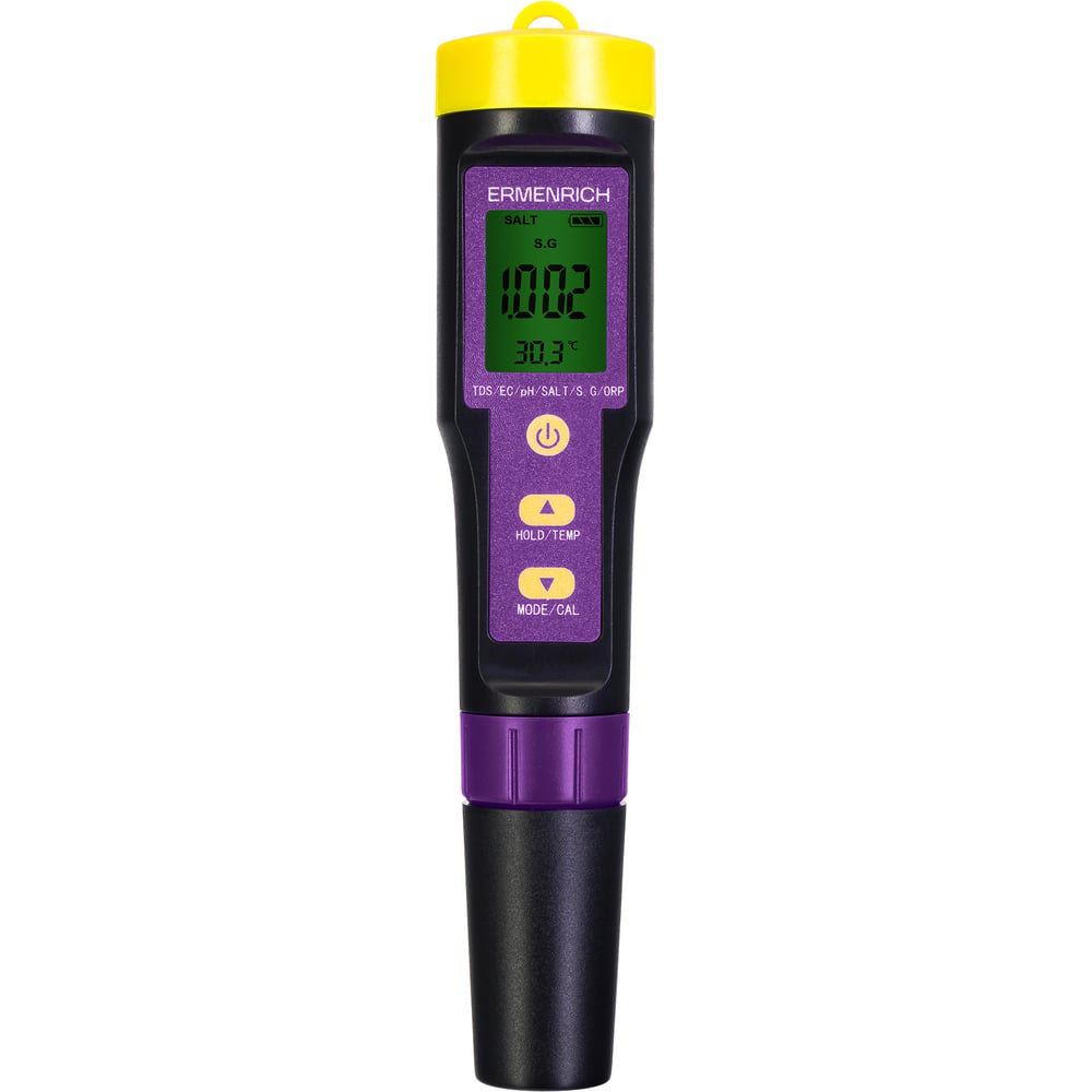 Тестер качества воды Ermenrich Wett QT40 – прибор для определения качества воды путем измерения 8 самых важных параметров: кислотности (pH), жесткости, электропроводности, солености, удельной плотности, ОВП, концентрации водорода, температуры. Тестер подходит для использования в домашних, офисных и промышленных условиях, он будет полезен в работе с аквариумами, общественными бассейнами, в лабораториях, при приготовлении еды, в рыбоводстве и при тестировании качества питьевой воды (из-под крана, из фильтров, домашних кувшинов). Измерение кислотности происходит в диапазоне 0–14 pH с погрешностью ±0,05 pH. Для калибровки устройства и улучшения точности его работы в комплекте поставляются порошки для приготовления буферных растворов – 4,00, 6,86 и 9,18 pH. Жесткость воды измеряется в диапазоне от 0 до 200000 ppm ±2%; электропроводность – от 0 до 200000 мкС/см (лучше всего результат определяется в промежутке от 10,1 до 200 мС/см); соленость – от 0,01 до 25% (или 0–10000 ppm); S.G. (удельная плотность) – от 1 до 1,222; ОВП – от 0 до ±1999 мВ с погрешностью ±2 мВ; концентрация водорода – от 0 до 10000 ppb. Измеряемый диапазон температуры воды совпадает с рабочей температурой устройства и составляет 0…+60 °С. Корпус прибора герметизирован по стандарту IP67, а значит, полностью защищен от пыли и от воды при кратковременном погружении на глубину до 1 метра. Для проведения тестов полностью помещать прибор под воду не требуется – достаточно зонда-наконечника.