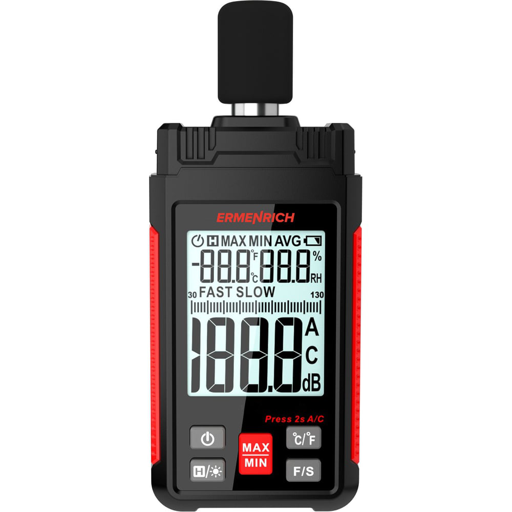 Шумомер Ermenrich Seek DS20 имеет встроенный гигрометр и термометр, что позволяет использовать один прибор для измерения сразу трех параметров окружающей среды. Благодаря этому он идеально подходит для таких задач, как контроль условий труда или проживания.Диапазон измерений шумомера – 30–130 дБ. Есть функция удержания текущих показаний и запоминания минимальных и максимальных значений. Термометр и гигрометр позволяют отслеживать температуру в диапазоне от –20 до +60 °C, влажность воздуха и точку росы.Работа прибора обеспечивается комплектом из 3 стандартных батареек типа ААА (нет в комплекте). Присутствует функция автоотключения, которую можно включать и выключать вручную. Индикатор низкого уровня заряда поможет своевременно заменить источник питания.