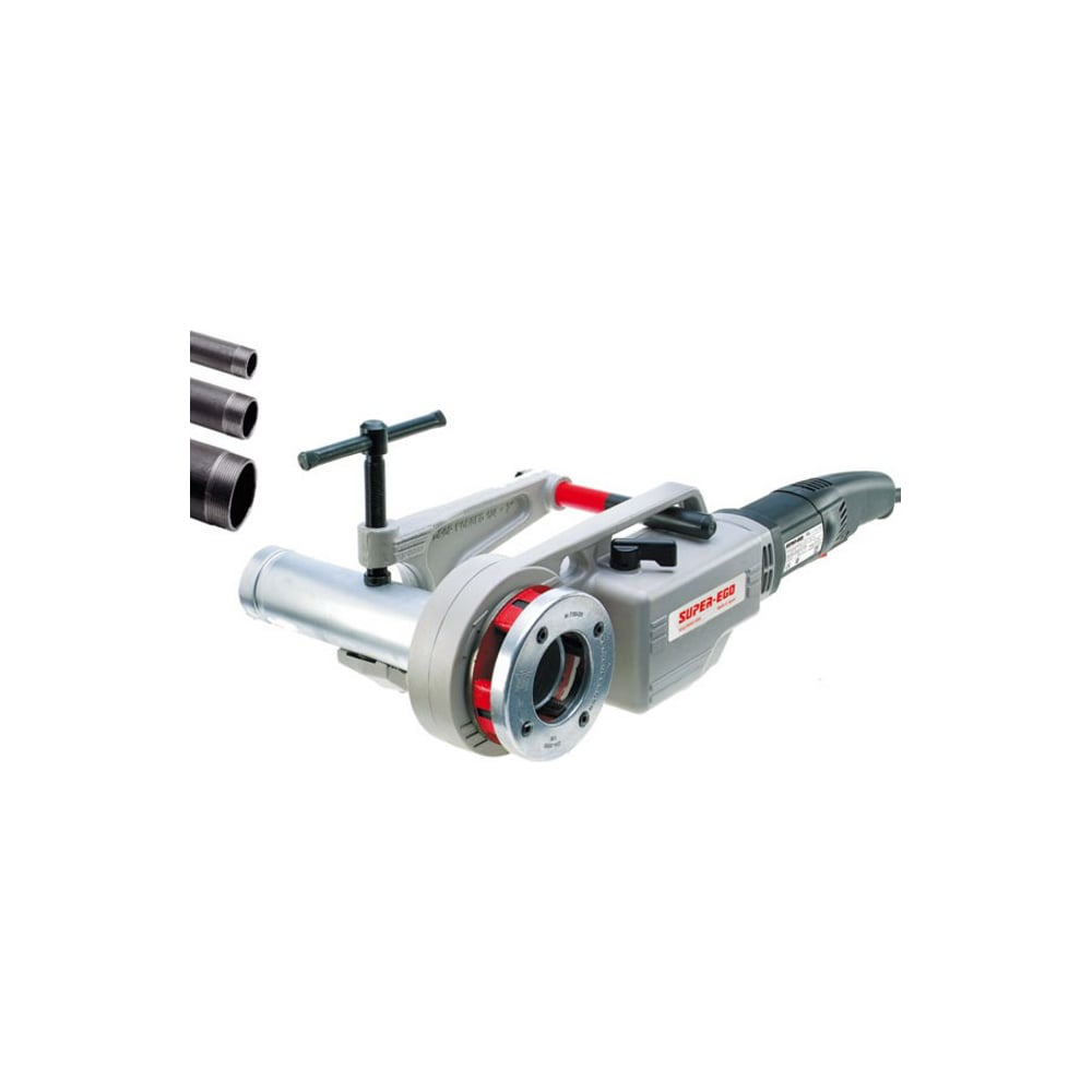 Электрический клупп в кейсе с головками 1/2”-2” SUPER-EGO supertronic 2000 864220200 имеет скорость резания от 15 до 20 об/мин (скорость обратного хода достигает 60 об/мин). Двойная изоляция обеспечивает безопасность модели в эксплуатации. Мощность двигателя составляет 1010 Вт. Пыленепроницаемый прочный корпус из алюминия увеличивает срок службы инструмента. Конструкция позволяет извлекать угольные щетки без необходимости разбора двигателя. Вес самого инструмента - 6.7 кг.