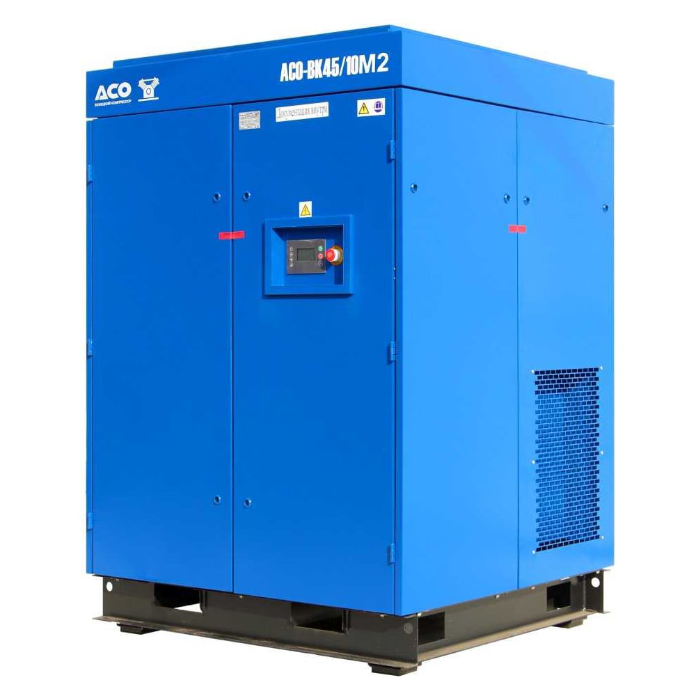 Винтовой стационарный компрессор АСО-ВК45/8М2 производства Бежецкого завода АСО имеет производительность по нагнетанию 7,2 м3/мин и максимальное рабочее давление 8 атм. Винтовой блок YNE133R (BAOSI) приводится в движение электроприводом мощностью 45 кВт. Компрессор работает в диапазоне температур от 5 до 40°С и имеет расход масла на унос не более 1 г/час. Уровень шума находится в пределах 72 - 76 дБа. Габариты установки составляют 130 х 125 х 185 см., масса 900 кг. Компрессор АСО-ВК45/8М2 оснащен ременным приводом, который сглаживает пуск за счет растяжения ремней и надежен при низких и средних мощностях двигателя. Применение ременного привода упрощает процесс эксплуатации, обслуживание может осуществляться самостоятельно, без привлечения сторонних специалистов. Компрессор с ременным приводом имеет более выгодную стоимость в сравнении с аналогичными моделями с другим типом привода. Устанавливается на компрессорах мощностью от 7,5 до 45 кВт. Система автоматического управления компрессором состоит из приборной панели, панели управления, датчиков температуры и давления. На приборной панели установлены аппараты электрооборудования. На панели управления расположен контроллер с кнопкой аварийного останова. Контроллер предназначен для автоматического управления работой агрегатом и её отключения при возникновении аварийных значений контролируемых параметров. Дисплей контроллера предназначен для отображения режима работы, текущих значений температуры, давления, настраиваемых параметров, сообщений об авариях и необходимости проведения сервисного обслуживания. При включении агрегата на дисплее контроллера могут быть выбраны для просмотра кнопками "Плюс", "Минус" следующие показатели работы агрегата: Температура воздуха (масловоздушной смеси) на выходе из винтового блока; Время наработки в рабочем режиме (под нагрузкой); Полное время наработки; Время, оставшееся до сервисного обслуживания. При появлении неисправности, код ошибки будет выведен на дисплей контроллера. Работа компрессора, переход в рабочий и холостой режим осуществляются автоматически. После достижения максимального рабочего давления, происходит переход агрегата в холостой режим и по истечении времени холостого хода, установленного в операционном меню, происходит останов агрегата с переходом в режим ожидания. Агрегат находится в режиме ожидания до тех пор, пока давление в пневмосистеме не упадёт до установленного значения, после чего автоматически произойдёт запуск. Агрегат снабжен автоматической системой аварийной защиты, с индикацией причины аварийного останова электродвигателя агрегата. Экстренная остановка и блокировка электродвигателя обеспечивается при следующих условиях: повышение давления в пневмосистеме выше установленного значения; аварийная температура масла; неправильном чередовании фаз электрической сети, перекосе фаз более установленного значения, обрыве фаз; срабатывании теплового токового реле.