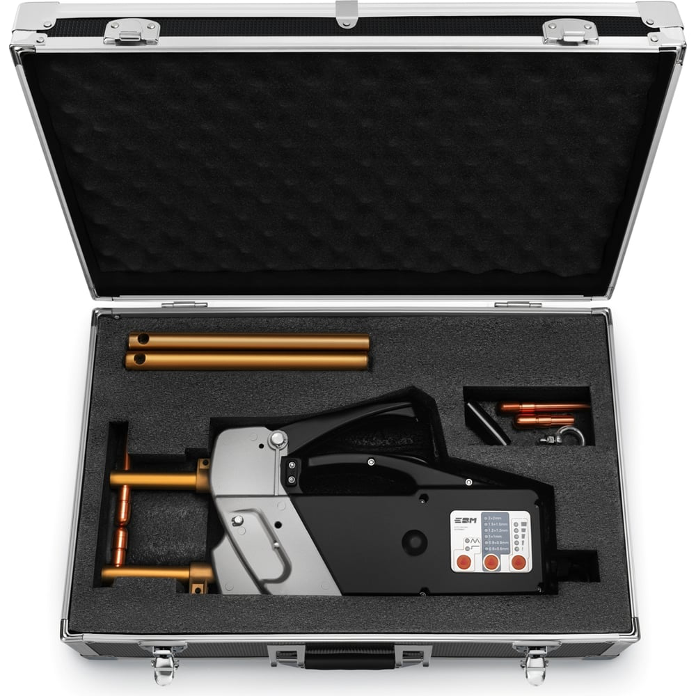 Ручные клещи SWT - переносной сварочный аппарат с микропроцессорным управлением, предназначенный для точечной сварки листов толщиной 2+2 мм.Автоматическая регулировка времени точечной сварки и тока в зависимости от выбранной толщины материала;Выбор между непрерывным и импульсным режимом работы;Наличие импульсного режима позволяет производить сварку листов из высокопрочной стали с высоким пределом текучести;Регулировка давления на консоль от 40 до 120 кг. (консоли 120 мм);Электронный таймер, с регулируемым временем точечной сварки от 0,1 сек. до 1,2 сек.;Ручка из термостойкого материала;В комплекте транспортировочный кейс и консоли 120 мм. и 250 мм. с электродами.Приварка треугольных звездПриварка круглых шайбПриварка шайб с ножкой (формы ОТ)Приварка волнистой проволокиПриварка шпилекНагрев угольным электродомОдносторонняя точечная сварка
