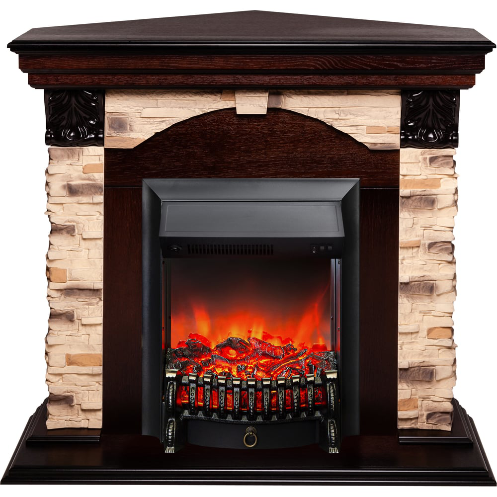 Угловой каминокомплект RealFlame Dublin corner rock std ao + Fobos lux BL выполнен из шпонированного МДФ и дикого камня. Комбинированное обрамление в контрастных цветах в "кантри-стиле". Лаконичный дизайн делает его универсальным для различных интерьеров и подходящим как для квартиры, так и для загородного дома.Электрический очаг Fobos Lux BL с открытым муляжом выполнен в точной копии тлеющих углей и небольших поленьев. Оригинальности и схожести с натуральным камином добавляет литая чугунная решетка и звук потрескивания дров. Обеспечивает обогрев в холодную погоду. Благодаря задней зеркальной стенке создается эффект объемного пламени и дополнительной игры света и тени.Звук потрескивающих дров и наличие обогрева усиливает сходство с настоящим очагом.Переключатель позволяет включать на полную (1500 Вт) или половинную (750 Вт) мощность. В режиме визуализации пламени потребление электроэнергии составляет 80 Вт.Очаг с функцией обогрева. 2 уровня регулировки обогрева.Мощность обогрева: 0,75/1,5 кВтЗащита от перегреваРегулировка яркости пламениЗвуковой эффект