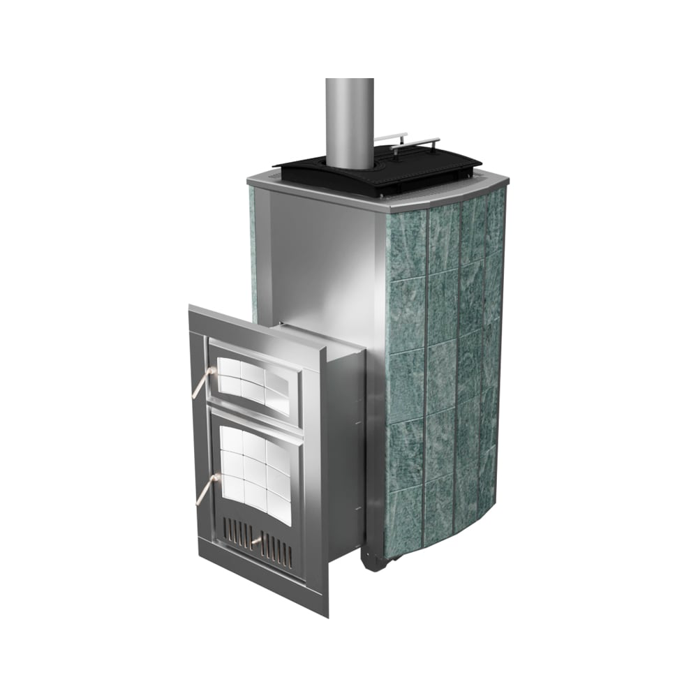 Дровяная печь для бани VVD Чародейка малая 2021 РУССКИЙ ПАР, топка сталь нержавеющая AISI439 4 мм, облицовка змеевик 10009 - уменьшенный вариант печи «Чародейка». Модель предназначена для эксплуатации в парных помещениях объёмом до 20 куб.м. Большая площадь контакта поверхности каменки с пламенем, наличие рёбер-регистров, а также система дожигания топливных газов, делают топочный агрегат печи, при его относительно небольшом весе, чрезвычайно мобильным и производительным, а в целом всю печь эффективной и экономной.