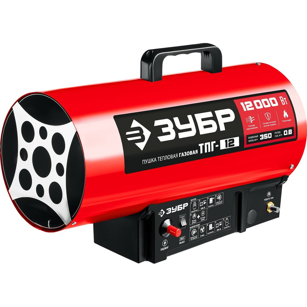 Газовая тепловая пушка ЗУБР 12 кВт ТПГ-12 - высокоэффективный газовый обогреватель, работающий на наиболее распространенном виде топлива. Оптимально подходит для использования для прогрева автосервисов, складов, производственных помещений строительных площадок и ангаров, а так же для монтажа натяжных потолков. Надежный поджиг дуги и эффективное горение гарантируют безотказную подачу тепла в любых условиях эксплуатации. Применяется для генерации горячего воздуха, который может быть использован для обогрева, сушки промышленных, складских, вспомогательных помещений и т. д.