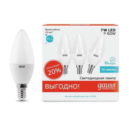 Лампа Gauss LED Elementary, Candle, мощность 7W, цоколь E14, цветовая температура 4100K (3 лампы в упаковке)