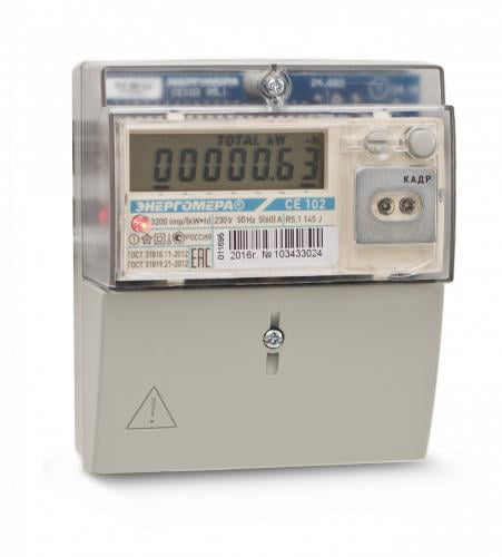 Счетчик электроэнергии однофазный многотарифный CE102M-R5Однофазный многотарифный электросчетчик серии «СЕ». Устанавливается на DIN-рейку. Измерение активной электроэнергии в однофазных цепях переменного тока. Организация учета по четырем тарифам с передачей накопленной информации через оптический интерфейс или RS485.