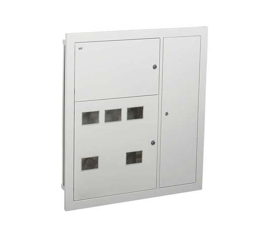 Используется для сборки этажного распределительного щита на 5 квартир, предназначенного для приема и распределения электроэнергии в жилых и общественных зданиях, а также для защиты отходящих линий при перегрузках и коротких замыканиях. Сварной металлический корпус состоит из трех отсеков: вводно-учетного, распределительного, отсека слаботочного оборудования. В вводно-учетном и распределительном отсеках размещены DIN-рейки для крепления счетчиков (по количеству квартир). В распределительном отсеке установлены DIN-рейки для аппаратов групповых линий и рейка для установки шин N и РЕ. Отсек укомплектован оперативной панелью. Отсек слаботочного оборудования снабжен перфорированными профилями для прокладки теле- и радиосетей, телефонных линий, сетей охранной сигнализации, домофонов и т.п. Для обеспечения пожарной безопасности между слаботочным и силовым отсеками расположена разделительная перегородка.
