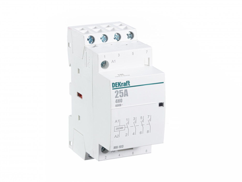 Контактор модульный 4НО 25А 230В МК-103 Модульный контактор серии МК-103 - это дистанционно управляемый коммутационный аппарат, позволяющий коммутировать нагрузки переменного тока. Контакторы имеют следующие основные узлы - контактную и дугогасительные системы, электромагнит управления. Модульные контакторы не требуют дополнительных настроек и специального обслуживания.