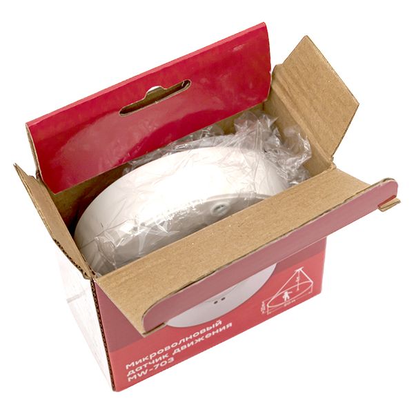 Датчик движения микроволновый MW-703 предназначен для экономии электроэнергии за счет автоматического управления освещением и другими инженерными системами. Датчик реагирует на движение людей и других объектов в зоне действия сенсора, принцип работы датчика основан на генерировании высокочастотных электромагнитных волн и детектировании полученного эха. Таким образом микроволновые датчики имеют повышенную чувствительность и могут детектировать движение сквозь тонкие преграды (гипсокартон, стекло, подвесной потолок и т.д.). Датчик MW-703 предназначен для накладного монтажа на потолок. Рекомендуется использовать датчик в кладовках, гардеробных и других помещениях с временным пребыванием людей. Алгоритм работы: при возникновении движения в поле зрения датчика встроенное электромеханическое реле (рассчитано на полную мощность 1200Вт) коммутирует подключенную нагрузку. После этого нагрузка находится под напряжением в течение заданного времени (от 10 сек. до 15 минут, время настраивается) и выключается.