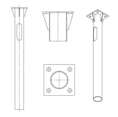 В зависимости от способа установки закладная деталь фундамента ЗДФ может быть фланцевого типа (Ф) или анкерного (А). Фланцевые закладные детали ЗДФ представляют из себя металлическую трубу определенного диаметра и длины, на одном из конце которой приварен толстый стальной фланец в форме квадрата или окружности с монтажными отверстиями под болты, которыми впоследствии к ЗДФ будет прикручиваться подпятник опоры или мачты.