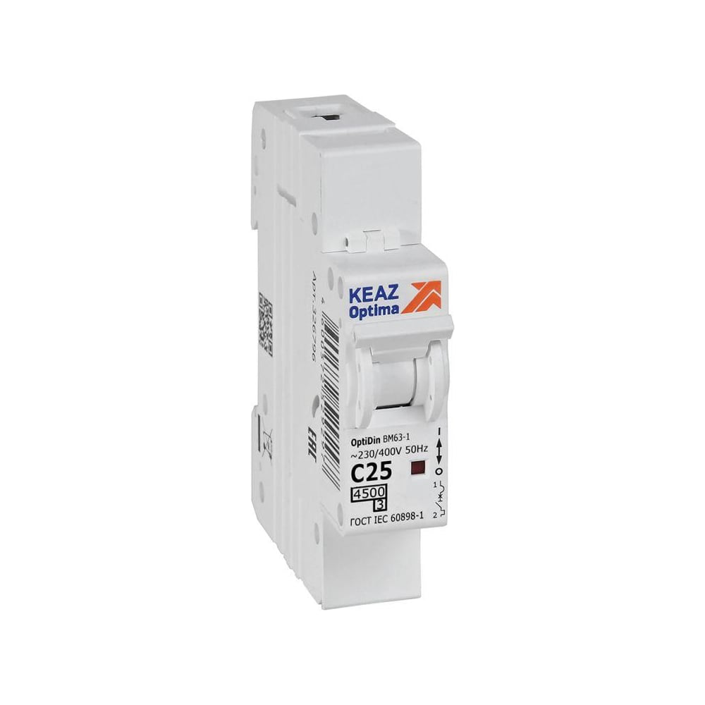 Модульный автоматический 1 полюсный выключатель переменного тока с предельной коммутационной способностью при переменном токе 4,5 кА на номинальный ток 25 А.