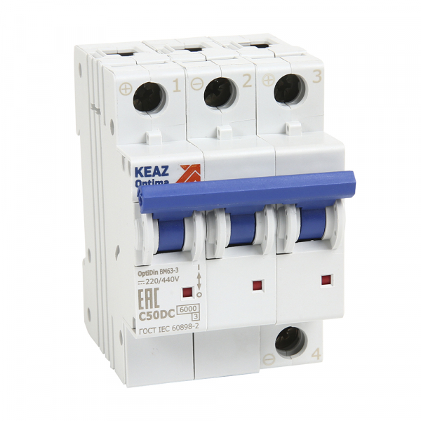 Модульный автоматический 3 полюсный выключатель постоянного тока с предельной коммутационной способностью при постоянном токе 6 кА на номинальный ток 25 А .
