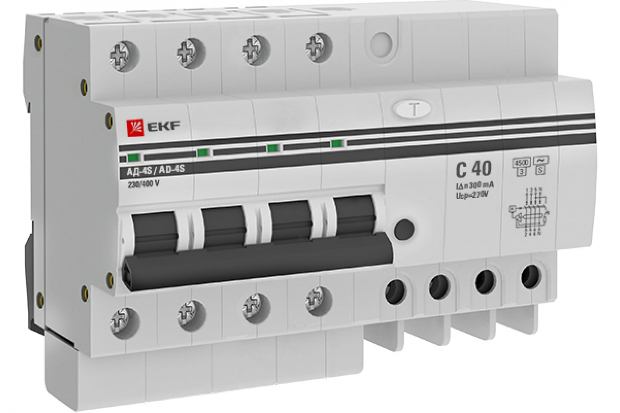 Дифференциальный автоматический выключатель АД-2(4) (S) EKF PROxima представляет собой аппарат, сочетающий функции автоматического выключателя с устройством защитного отключения. При обнаружении автоматическим выключателем в защищаемом участке сети тока утечки (повреждения) на землю или сверхтока (тока перегрузки или короткого замыкания) происходит срабатывание устройства, приводящее к отключению защищаемой сети. Особое отличие дифференциальных автоматов EKF – в наличии встроенного блока защиты от перенапряжения. АД-2 и АД-4 EKF PROxima выпускаются в стандартном и селективном (АД-2S, АД-4S) исполнениях.