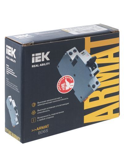 Автоматические выключатели дифференциального тока (АВДТ) ARMAT серии B06S могут осуществляют функции защиты от токов перегрузки и короткого замыкания и защиты человека от токов замыкания на землю. Модельный ряд включает в себя устройства с номинальными токами от 6 до 32 А, характеристиками срабатывания по сверхтоку B и C, типами защит AC и A с номинальным дифференциальным током отключения 30 мА. Номинальная отключающая способность АВДТ ARMAT серии B06S составляет 6 кА.